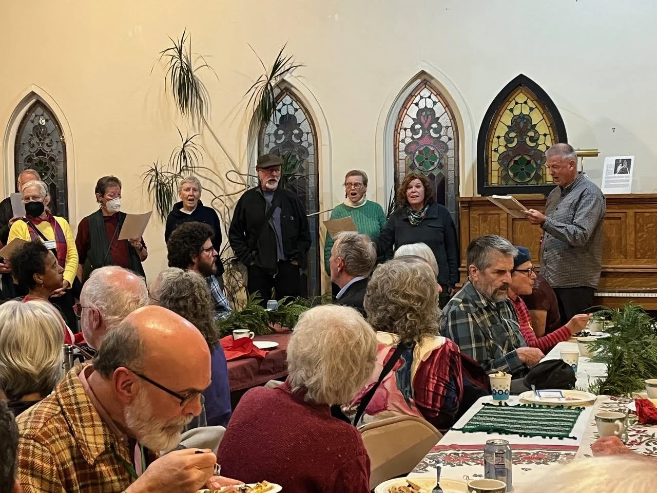 Despite the news of the Pantry’s impending closure, the December 7 end-of-year party was a wonderful and spirited gathering. Volunteers enjoyed good company, delicious food, and we were fortunate to have carolers – the Berkeley Community Choir – join us and perform several Christmas carols. Party-goers were able to share what made the Pantry and volunteering special to them. “Working with my heart”, “connecting and hearing clients’ stories”, “making new friends – 80 and still trucking”, “helping in one way, and then another, and then another” were among the highlights.